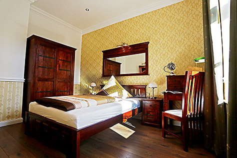 Für unsere reisenden Gäste bieten unsere Komfortzimmer genau das richtige Maß an Luxus, um sich rundum wohl zu fühlen. Die hochwertigen Vollholzmöbel im Stil der indischen Kolonialzeit verleihen den Zimmern einen ganz eigenen modern-klassischen Stil und erzeugen so eine individuelle Wohlfühlatmosphäre. Der Blick vom Balkon geht auf unseren mediterranen Innenhof, der mit exotischen Palmen und Brunnen ein südländisches Flair mitten in Berlin zaubert.